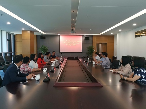 5月21日上午,世界杯下单官方网站执行院长居海滨在江海智汇园D1楼二楼会议室接待了老挝科技部官员布曼翁.苏莎莉女士(Somsanith BOAUMANIVONG)、老挝女双手公司总经理江月琴(Saysouda SAYASONE)、江月(Saysukountha SAYASONE)一行。研究院特聘教授徐世清陪同接待。